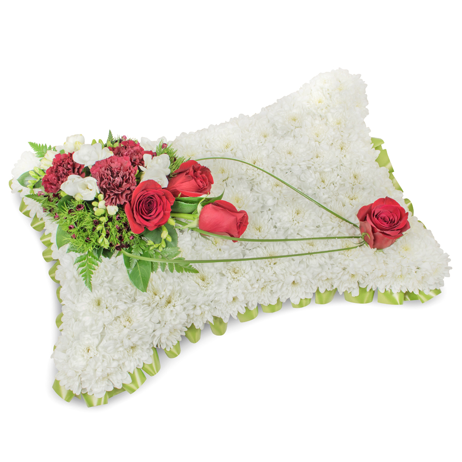Convey your heartfelt condolences with our delicate sympathy flower arrangement, designed to bring comfort and beauty during trying times. This charming bouquet includes white chrysanthemums, red roses, white freesias, and dark red carnations, gracefully complemented by dianthus and bear grass.